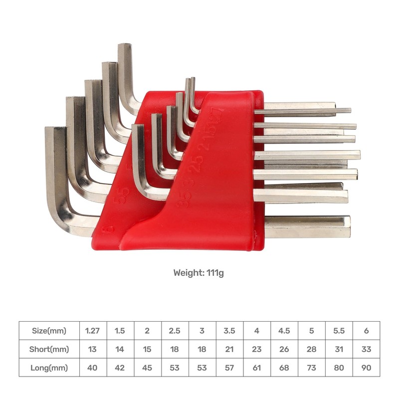 11pc Small Metric Hex Allen Key Wrench Tool Set. 1.27-6mm Long and Short Arm Sizes of Hard Alloy in a Compact Holder