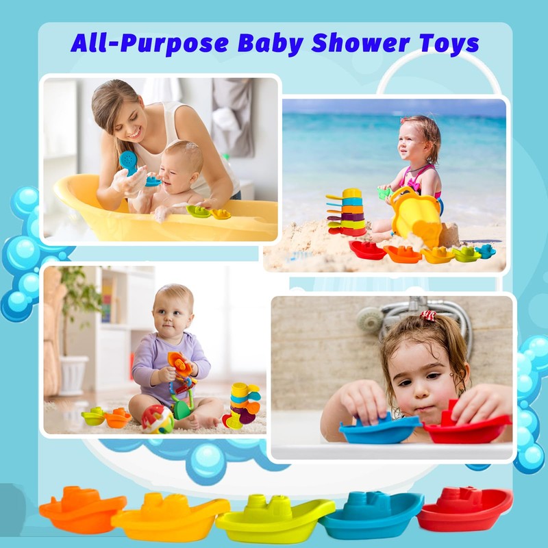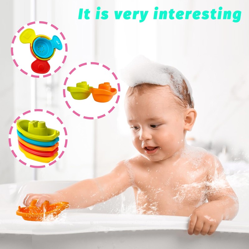 • Attractive design:Stackable floating boat toys are colorful and contain 6 colors (red,orange,yellow,green,blue,purple),each boat size about 4.1inch.The colorful bath spoon has a variety of shapes on the front,and numbers on the back,children can learn to read pictures and words in play,which come in 6 different dimension.
