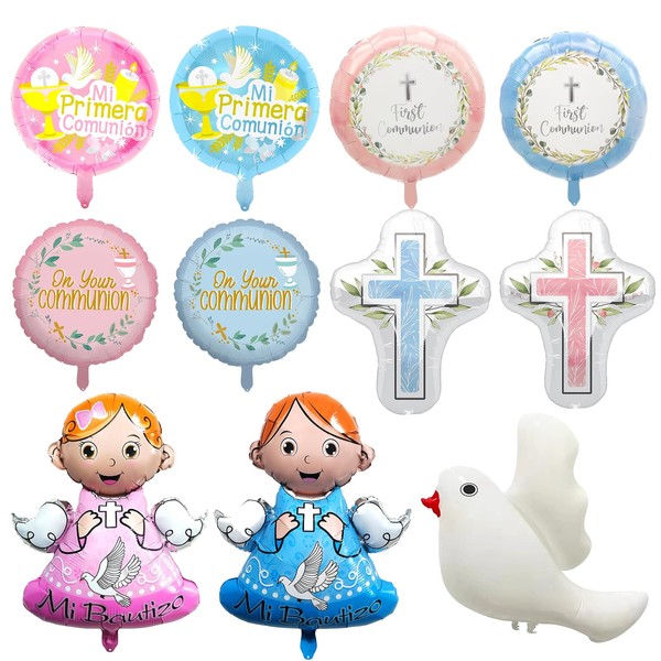 - ️️ Baptism Communion Balloons Set: Package contains 2 balloons with children figures, 1 white dove balloon, 2 cross balloons, 6 round foil balloons. Use the baptism balloons to decorate your communion party, they are ideal for creating a festive atmosphere.