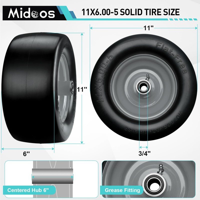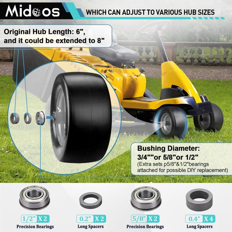 - 【Parameters】11x 6.00-5 Tires x 2, tread type: smooth, Tire Diameter: 11", Tire Width: 6", Axle Bore Diameter:3/4" Precision bearings with extra with 4 additional 5/8" and 1/2" precision bearings, Hub Length: 6"-8"(adjustable with metal spacers), 0.4" metal spacers x 8, 0.2"metal spacers x 4, which can greatly expand its applicability. Whether you are a DIY enthusiast or a professional mechanic, you can easily install this tire. Note: Our tires belong to NHS series tires, not suitable for high speed service!