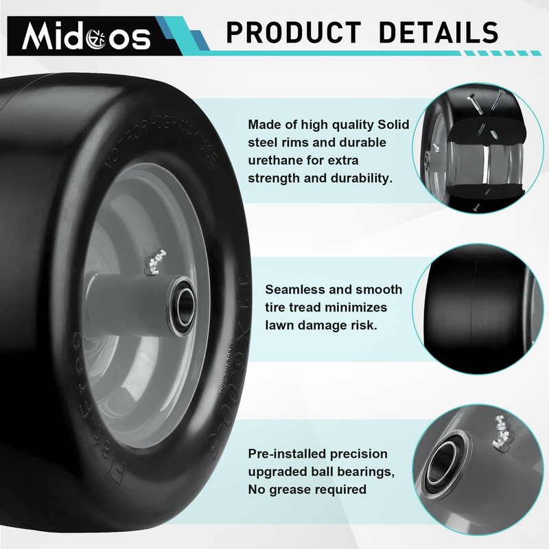 - 【High Quality】Solid tires are made of more durable PU material (polyurethane), which has the high resilience and cushioning of pneumatic tires, but you don't worry about the inflation problem. The rims are made of high quality steel, and the lawn mower surface also features a smooth tires design, which prevents rutting and lawn damage to minimize the impact on your lawn. The sturdy and durable construction ensures that you are safe and comfortable when using the lawn mower tires.