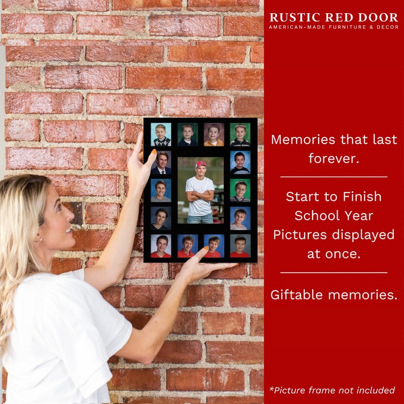 - (BULK, QTY 2) 2 PRE-SCHOOL - 12TH GRADE BLACK PICTURE MATS (frames NOT included): The Rustic Red Door School Days Mats are handcrafted with care to ensure the highest quality. These black picture mats have outside dimensions of 11" x 14". We've designed these mat with 15 beveled spaces for your child's photographs. These mats have 14 small-sized openings measuring approximately 1⅞" x 2⅛" with a large 4½" x 6½" center space for any photo you choose.