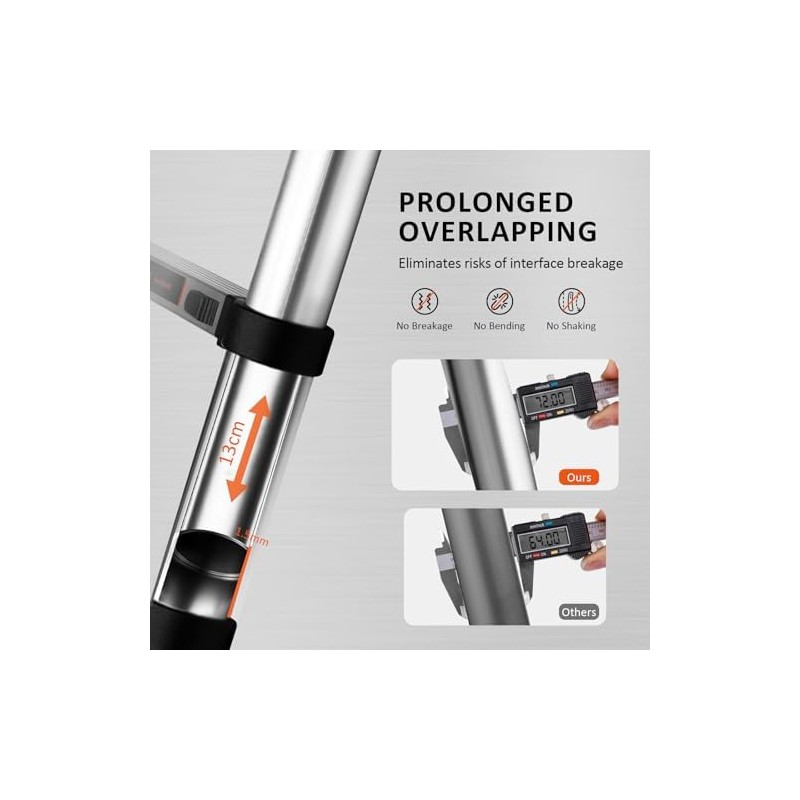 - REDUCED WOBBLE WITH SUPERIOR LOAD CAPACITY: After extensive testing,the telescoping ladder,crafted from aviation-grade aluminum alloy,supports up to 330 lbs (150 kg),We added triangular stabilizers,reducing shaking from 30°to 10°and increasing stability by 36%,Reinforced nylon plastic interfaces enhance durability and prevent breakage,ANSI and EN131 certified,it ensures a long service life. Get ready to reach new heights!
