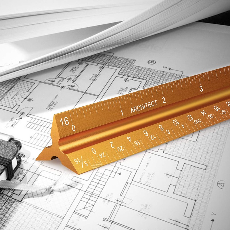 12" Architectural Scale Ruler Aluminum Architect Scale Triangular Scale Ruler for Architects, Draftsman, Students and Engineers, Golden