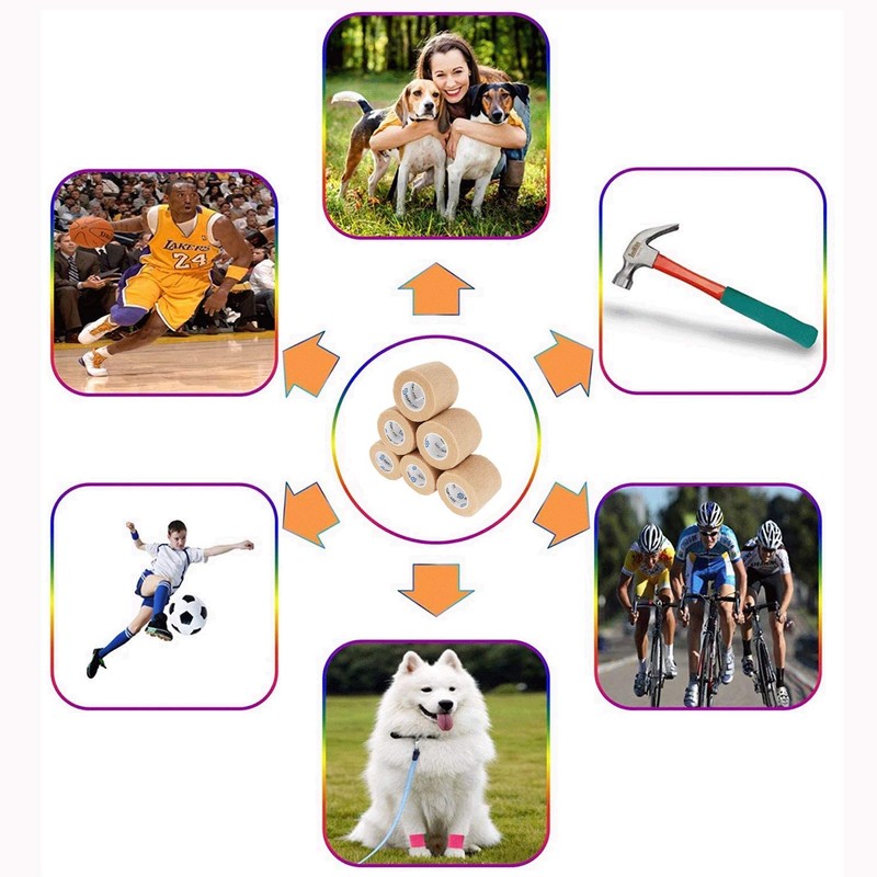 - 家族全員のための軽量の粘着テープ:10代と大人は、通常これらの自己粘着ラップを通常のスポーツテープ、リストラップ、足首包帯、またはアスレチックラップとしてどこでも使用します。しかし、そのラテックスフリーと素材のために、アクティブな子供のためにこれらの粘着性包帯ラップを使用することもできます。また、粘着性の包帯が理想的なサポートと保護を提供するため、これらの伸縮性のある包帯を毛皮のような友達の包帯として使用することもできます。