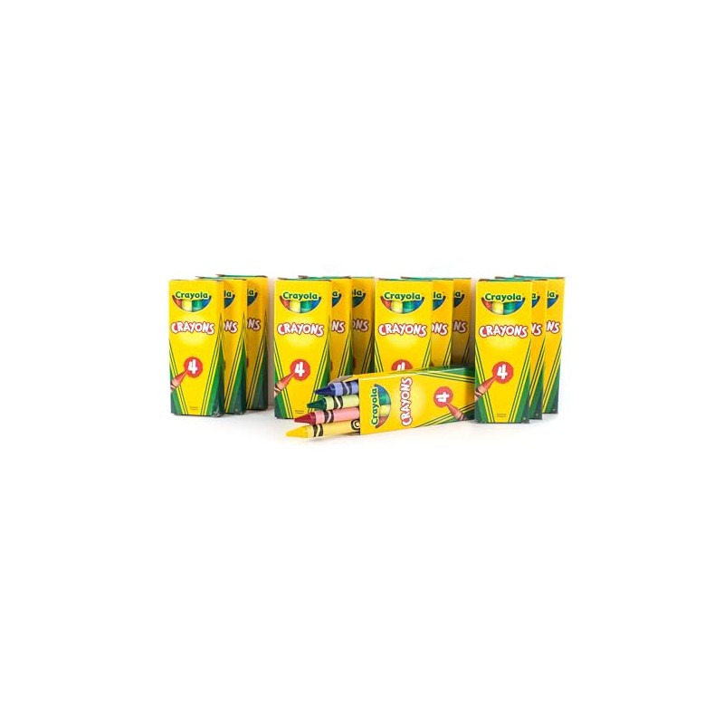- 12 boxes each containing 4 wax crayons (red, blue, green, yellow), wrapped for shipping.