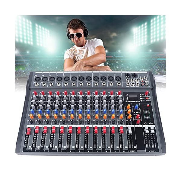 12 Channel Audio Mixer, Bluetooth USB Live Studio GDAE10 DJ Professional Mixing Console Power Amplifier Sound Board Desk System Interface Digital MP3 Computer Output Recording Input + XLR
