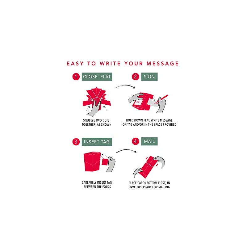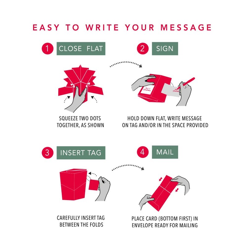 Instructions: Just close the pop up flat and write your message in the space on the side of the card or on the tag provided before placing in the envelope for sending