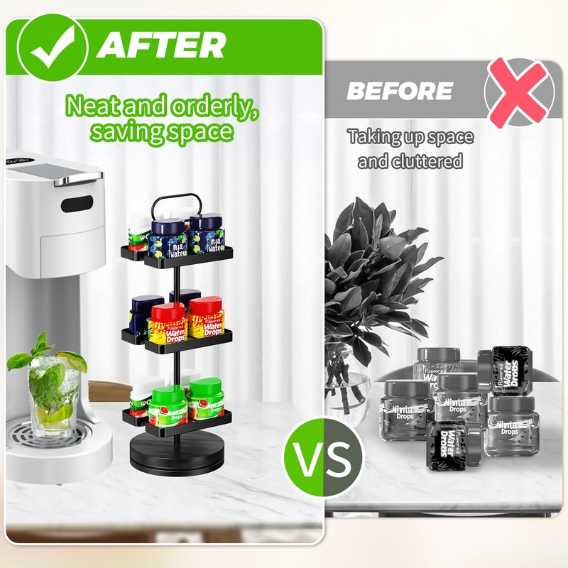 - 【Space Saving】 Our flavor storage holder adopts a 3-layer vertical storage design, which effectively saves countertop space and provides ample storage space for thirsties drink system. You can place it near the coffee maker or water dispenser to keep your desktop clutter-free