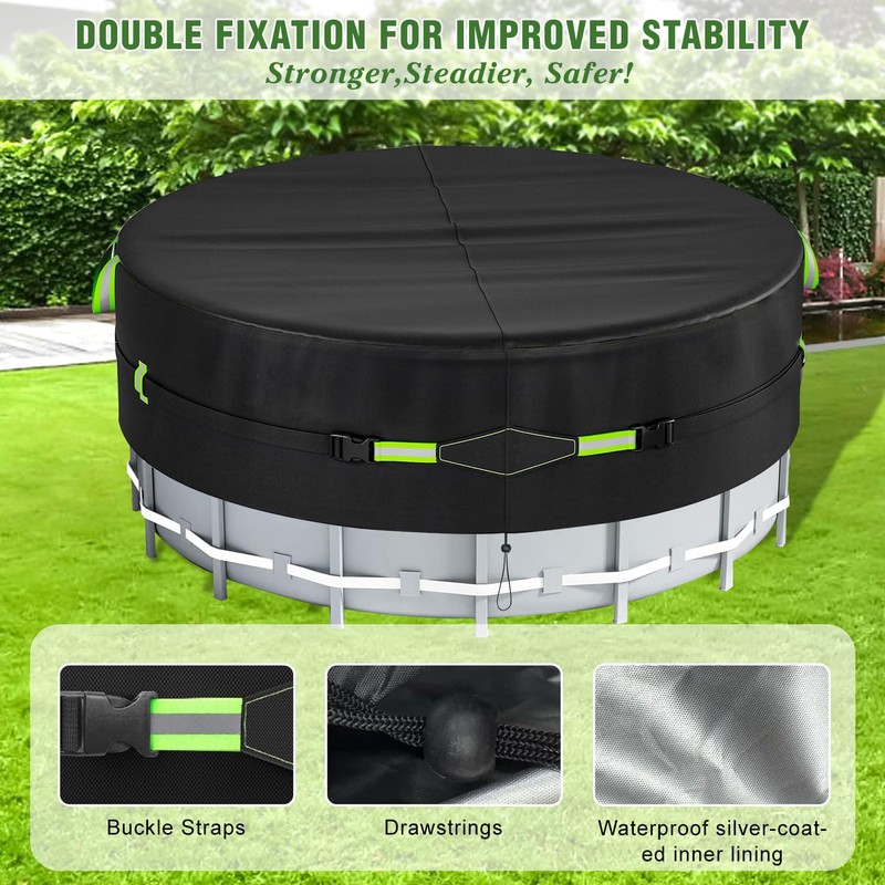 - 【Triple Windproof Design】The solar pool cover features new gel-coated anti-slip straps, ensuring stability in harsh weather without the need for additional weights.Dual drawstrings at the bottom and adjustable straps on both sides provide a tight, secure fit and all-around protection, easily withstanding hurricane-force winds.