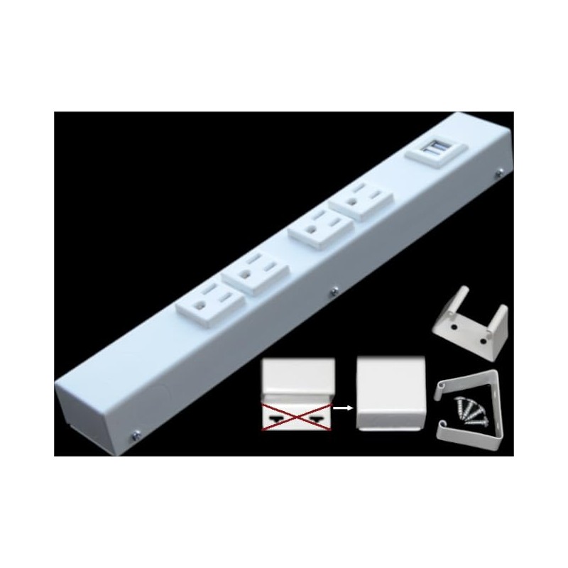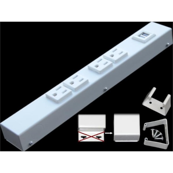 - 12” / 0.30m Steel Hardwired Power Strip, 4 Vertical (NOT Tamper Resistant) Outlets, USB, White