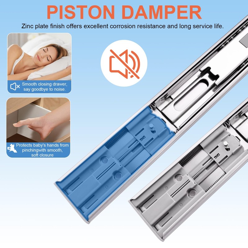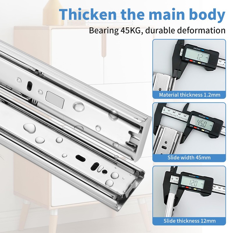 - [3-Fold full extension & Detachable]:There is a plastic buckle on the back of the slide rail, by pressing it,the 3rdtrack(the narrowest section) can be separated.Easy to take down and clean.At the same time,double anti-drop function would prevent drawer separate from cabinets.The 3-fold full extension allows for the entire drawer to be accessed.Three-stage stretching can pull out the drawer completely.Make full use of your drawer space.