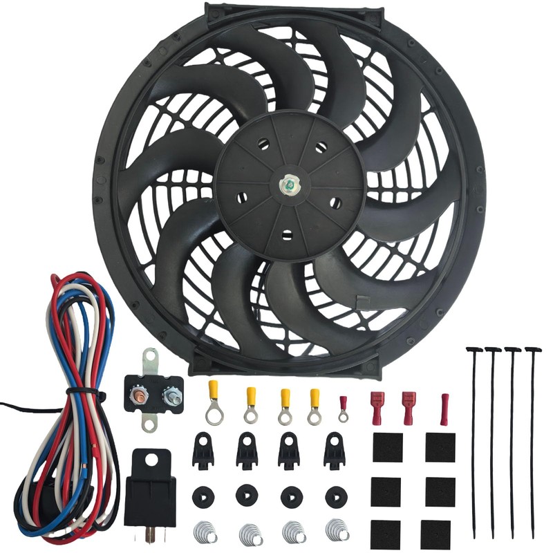 12 inch Electric Radiator Cooling Fan Black with CFM Thermostat Wiring Switch Relay Kit, 12V