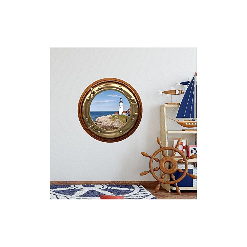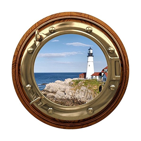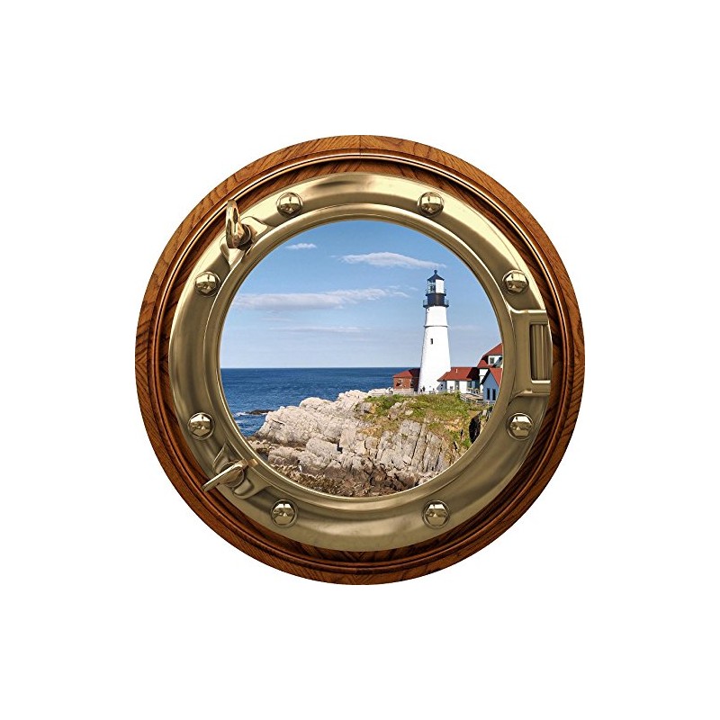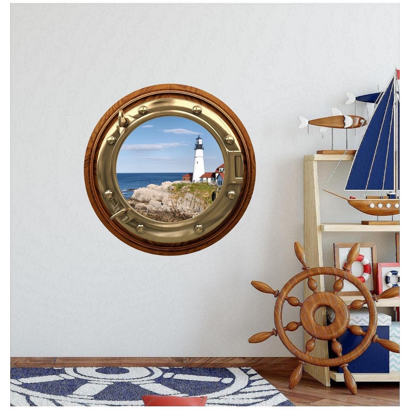 12 inch Port Scape Lighthouse 2 Brasswod Porthole Window Wall Sticker Decal Graphic Instant Sea Window View Nautical Sea Decor
