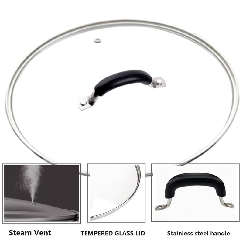 - TEMPERED GLASS LID - The glass lid is made of heavy-duty, heat-resistant tempered glass and a sturdy stainless steel rim, making it safe to use in the kitchen.