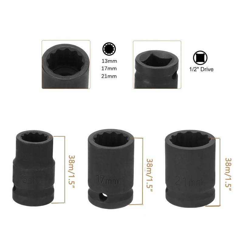 - Größe:Antrieb:1/5.1 cm, 12-kant Steckschlüsselgröße:13/17/21mm, Gesamtlänge 38mm / 1.49inch Die Spezifikationen sind deutlich auf der Oberfläche der Steckdose gekennzeichnet, was leicht zu identifizieren ist und die Arbeitseffizienz verbessert.