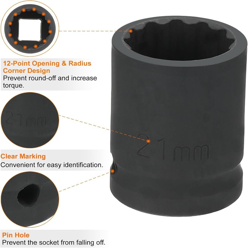 - 【Material】 Der 13/17/21 mm Stecknuss 1/2 Antrieb ist aus einer hochwertigen Schlaggrad-Chrom-Molybdän-Stahlkonstruktion mit korrosionsbeständiger schwarzer Phosphatbeschichtung hergestellt. Der 12-Punkt-Schlag-Stecknuss hat einen guten Abrieb.