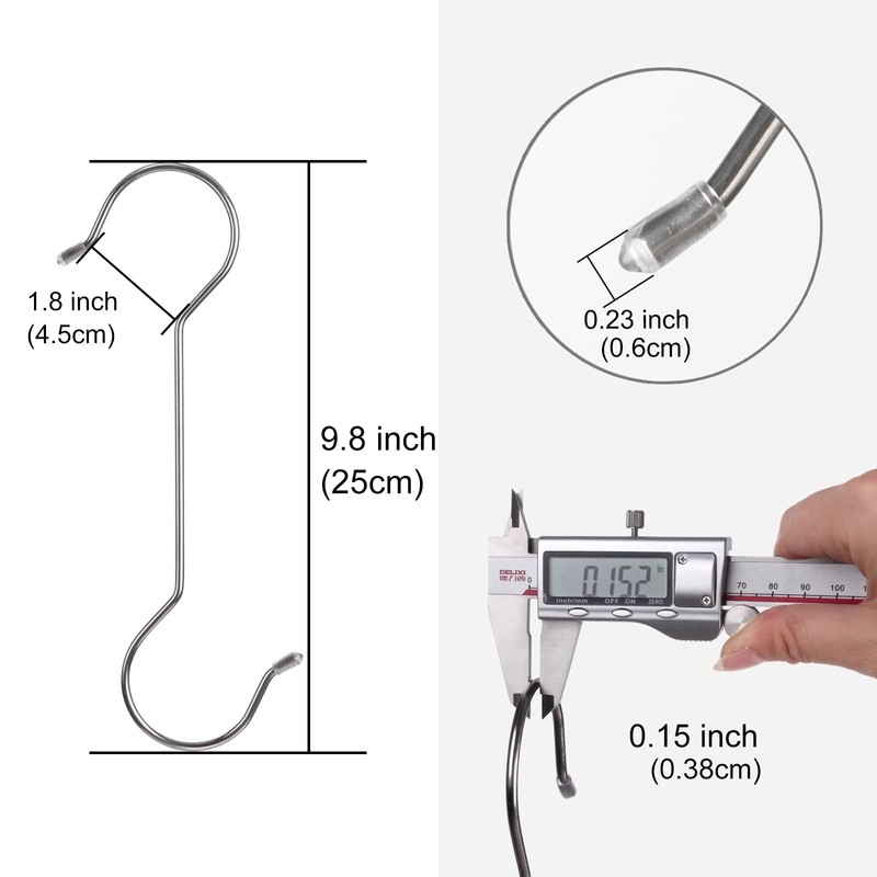 12 Large S-Shaped Hooks, Long Stainless Steel Clothesline (9.8 inch - 12 Pack)