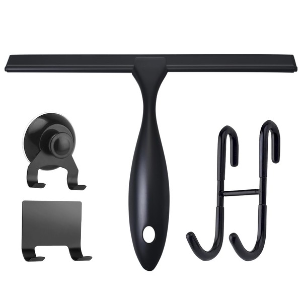 12'' Light Weight Stainless Steel Squeegee with 4 Pieces Set 1 Squeegee,1 Door Hook and 2 Adhesive Hooks (Black)