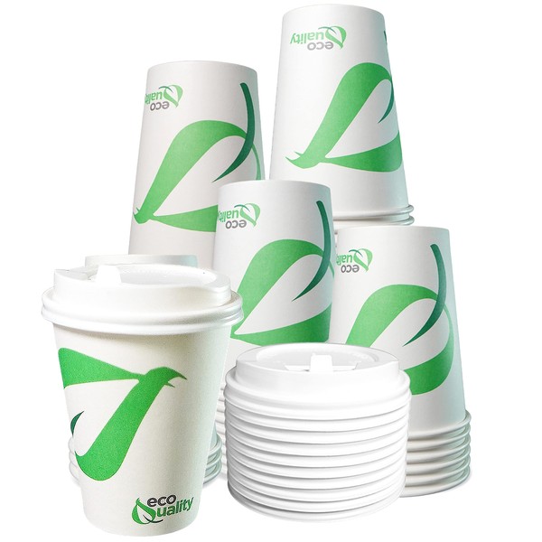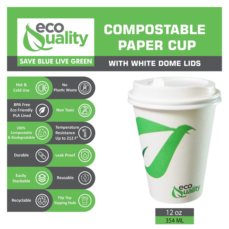 12 oz Compostable Paper Cups with White Dome Lids - Biodegradable Disposable ...
