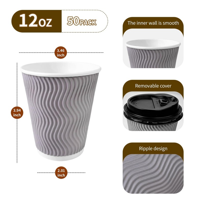 12 oz Disposable Coffee Cups with Lids - 50 Pack, To Go Hot Coffee Cups with Lids, Double Corrugated Ripple Wall Hot Cold Drink Paper Cups for Home Office Work Morning Coffee Bar Grey