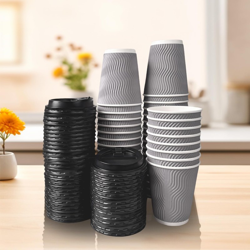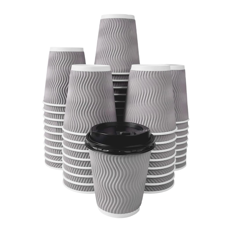 Elevate your beverage service with these sophisticated black ripple wall cups. The 12 oz & 16 oz capacity is perfect for serving both hot and cold drinks, while the distinctive corrugated design provides excellent insulation and a secure grip. This pack of 50 disposable cups features a sleek black exterior with an elegant wave pattern texture, complemented by a clean white rim. The sturdy construction helps prevent heat transfer, keeping hot drinks warm and cold drinks chilled while protecting hands from temperature extremes. These versatile cups are ideal for coffee shops, office break rooms, catering events, or home use. The practical design includes a rolled rim for comfortable sipping and secure lid compatibility. Whether you're serving coffee, tea, cold brew, or other beverages, these cups deliver both style and functionality. The convenient bulk pack of 50 ensures you'll always have cups on hand for any occasion.