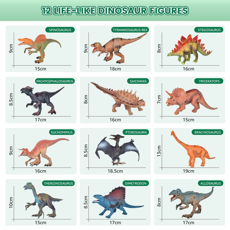 - Realistic Dinosaur Toys: Plastic Dinosaur Toys contain 12 different types of dinosaurs, giving kids a chance to explore the world of dinosaurs away from video games.