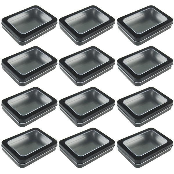 12 Pack Empty Rectangular Metal Storage Organizer Tins with Clear Window Hinged Lids for Small Items and Other Craft Projects, 4.5 x 3.3 x 0.9 inch (Black)