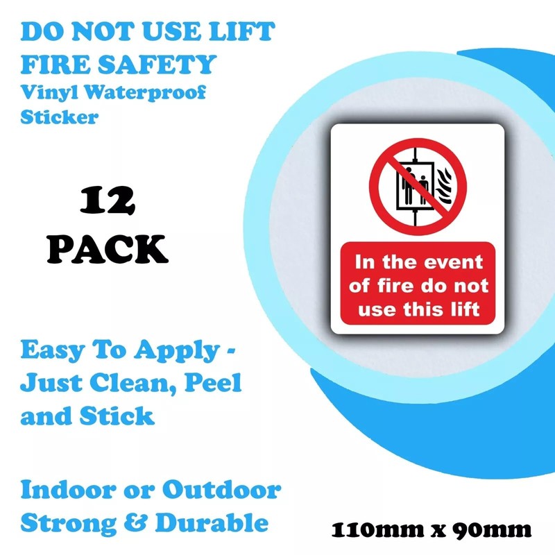 12-Pack in The Event of Fire Do Not Use This Lift Vinyl Sticker Notice Signs - Water/Weather Proof/Long Lasting