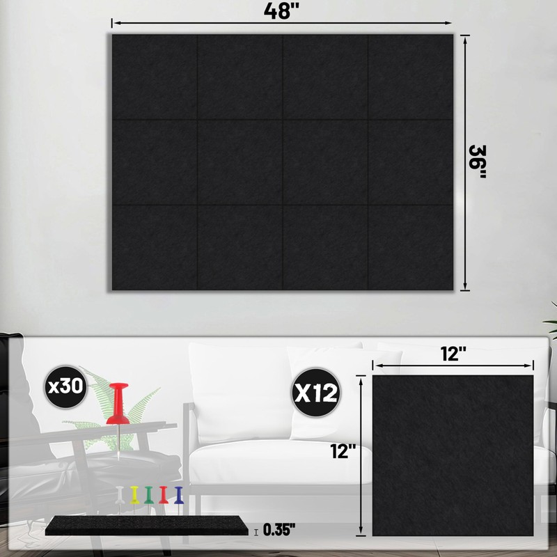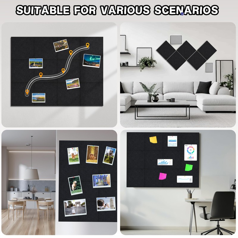 - 【Customizable Large Design】Made with 12 pieces of high-quality 12“ x 12” black felt panels, it can be easily customized to any size you need (maximum size 48“ x 36”). The 0.35" thick high-density felt panels can be flexibly combined into different sizes—suitable for offices, classrooms, or home decoration. (Push pins are inserted at a 45° angle to ensure excellent load-bearing stability.)