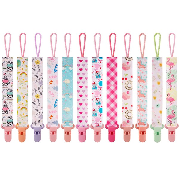 12 Pack Pacifier Clips with Strap 25.5cm - Premium Polyester Baby Pacifier Holder Set, Multi-Design Clips for Girls Boys(Multi Color B)