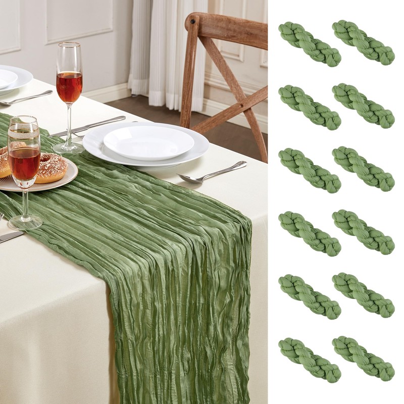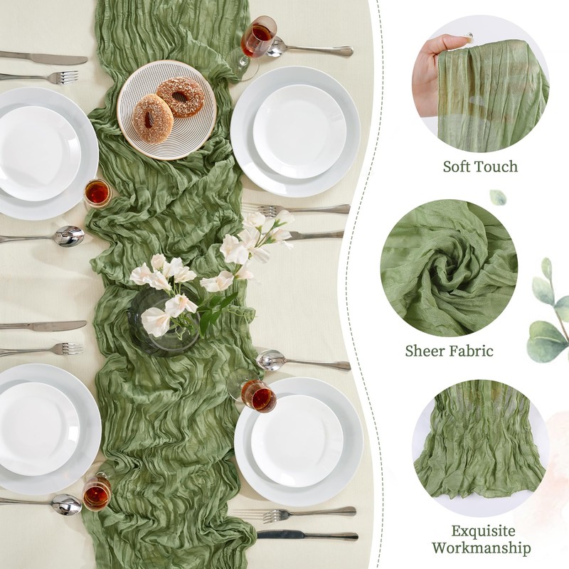 - PACKAGE INCLUDED: You will receive 12 pieces of sage green cheesecloth table runners. Elegant and beautiful design, exquisite workmanship. Product size: Each boho table runner is 35 x 120 inches. Enough to cover rectangles and round tables, as well as long tables that are stitched together. It can even be used to belt chairs decorate napkins, background curtains. Round or square tables for 8-10 people, perfect for romantic and elegant party events