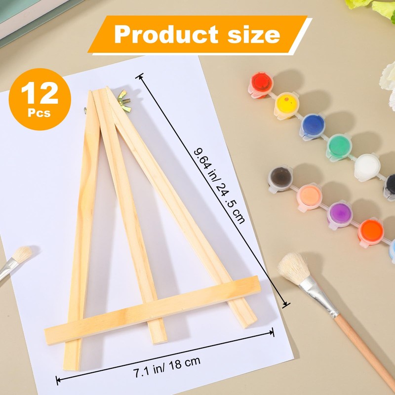 This 12-pack of wooden easel for painting features 9.64"x7.1" tabletop easels with triangular bases. The wood easel for painting set includes durable tabletop easels perfect for artists and students. These small wooden easel stands work as versatile table top easels for canvases up to 11". Ideal wood easels for classrooms, studios, or home use. The small easels for painting set makes creative displays effortless.