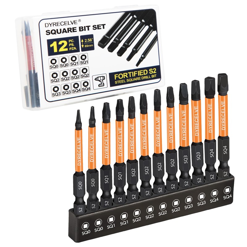 - 🔨【FULL GENERAL SIZE】12-pack square bits sizes: (2X) SQ0, (2X) SQ1, (4X) SQ2, (2X) SQ3, (2X) SQ4, applicable to all kinds of inner square screws. Each drill bit is labeled with its square bit size.