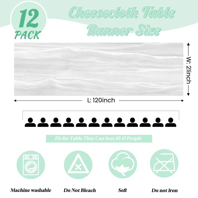 12 Pack White Table Runner 10FT Cheesecloth Table Runner 21 x 120 inch Boho Gauze Cheese Cloth Table Runners Rustic Sheer Table Runners for Party Wedding Bridal Baby Shower Birthday Table Decor