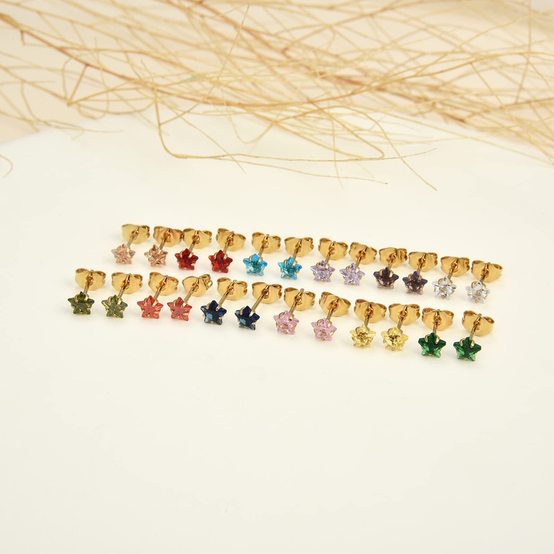 - STAR CUBIC ZIRCONIA STUD EARRINGS- 12 pairs heart shape CZ stud earrings in different colors for your more selections; 18K yellow gold plating over surgical stainless steel to ensure the color a long time lasting