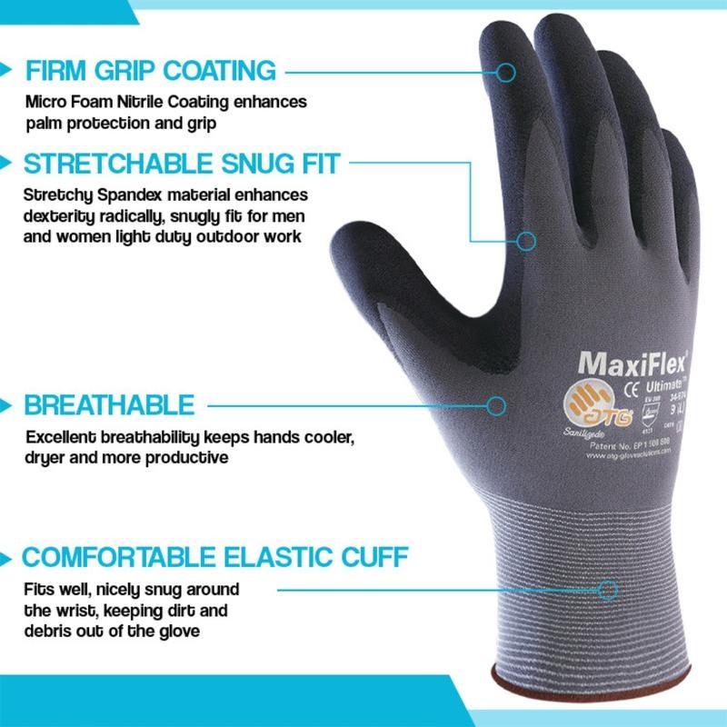 Coated glovesDesigned and developed as a breathable glove, Maxiflex ultimate has become the benchmark for precision handling in dry environments. The micro-foam nitrile palm coating is compatible with light oils and will provide a good grip and excellent abrasion resistance, while the knit wrist helps prevent dirt and debris from entering the glove.