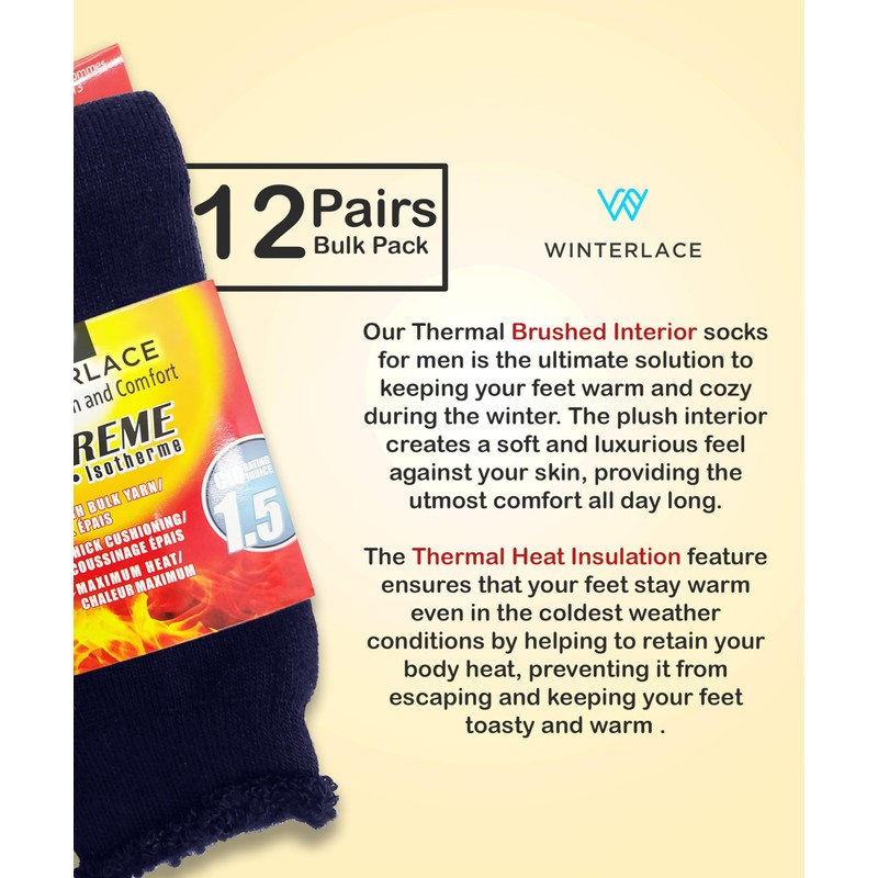 - 12 PAIRS WINTER BRUSHED SOCKS : Brave the cold weather for all occasions, activities, and the outdoors with these thick heavy duty brushed thermal socks. The brushed interior offers a soft and cozy sensation that will reduce fatigue and keep your feet and toes toasty. Offers a texture that is softer and easier to maintain than wool while still keeping your feet just as warm!