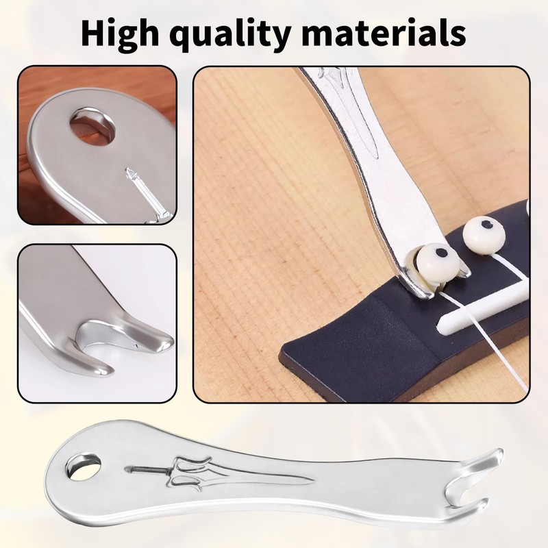 Acoustic guitar pin puller is made of zinc alloy, sturdy and durable. The innovative U-shaped design matches the bridge pins perfectly and is very easy to install and remove.