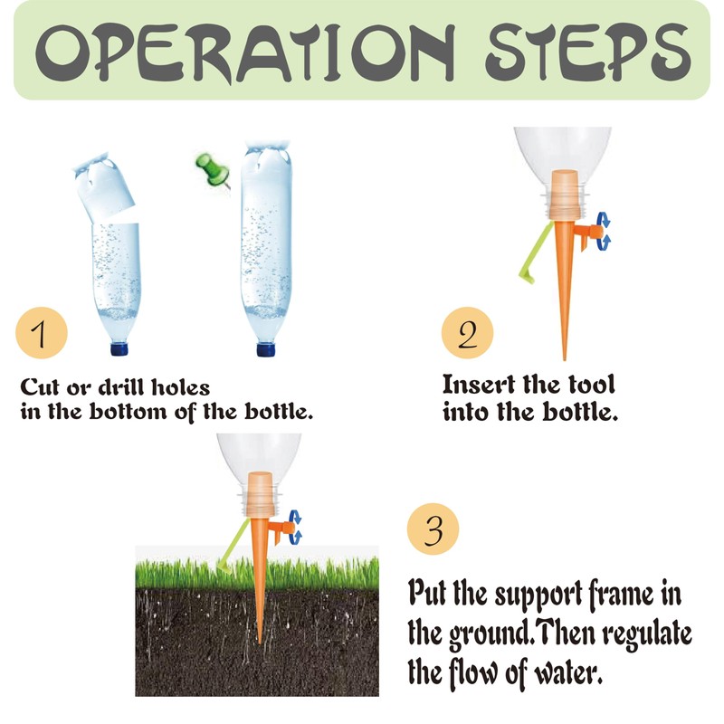 • Easy to useThe operation is simple. Drill a few holes or cut the bottom of the bottle, install a regulating valve that can adjust the flow, and then insert the drip irrigation tube into the soil and fix it. It is suitable for use with most bottles.
