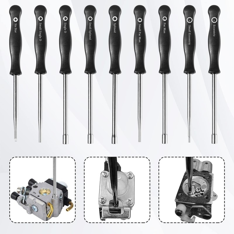 - 【Product Included】Including 12pcs carberator adjustment tool(Pac Man/Small Pac Man/Single D/Small Single D/Splined/Small Splined/Eccentric/Small Eccentric/-Shapda/Six Star/Hexagon/Double D), 1 carberator cleaning kit(10 cleaning needles+5 cleaning brushes+1 hexagonal wrench) and 1 tool carrying case.