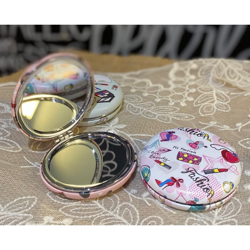 • The compact opens at the side with a hinge and reveals two glass mirrors. One is a regular mirror and the second is magnified. Anti fog glass lens.