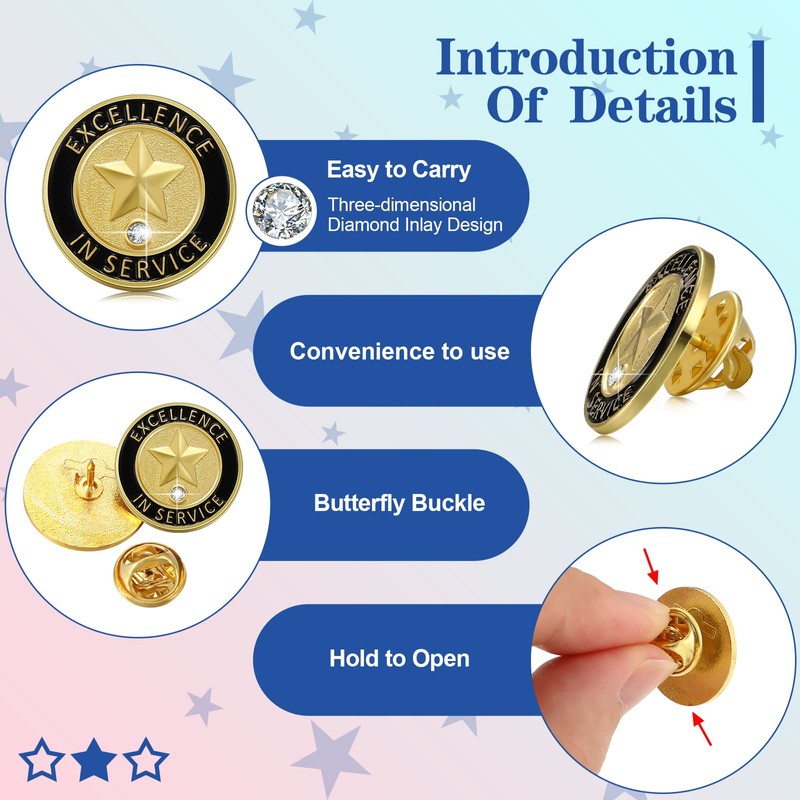 • Easy to Use: the badge can be applied as workplace award badges to mark outstanding monthly service by employees and encourage pins; Each pin comes with a gold bow backing, and the pin is centered at the back of the pin, easy to stick on the clothes, bags and other places