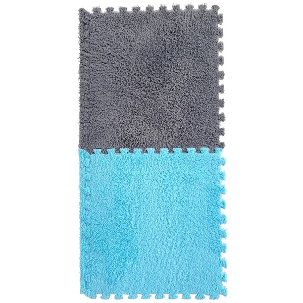 12 Pcs Interlocking Carpet Shaggy Tiles - 12" x 12", 12 Sq,Ft Foam Carpet Squares Protective Floor Mats Soft Fluffy Bedroom Kids Area Rugs for Classroom Use, Grey+Blue