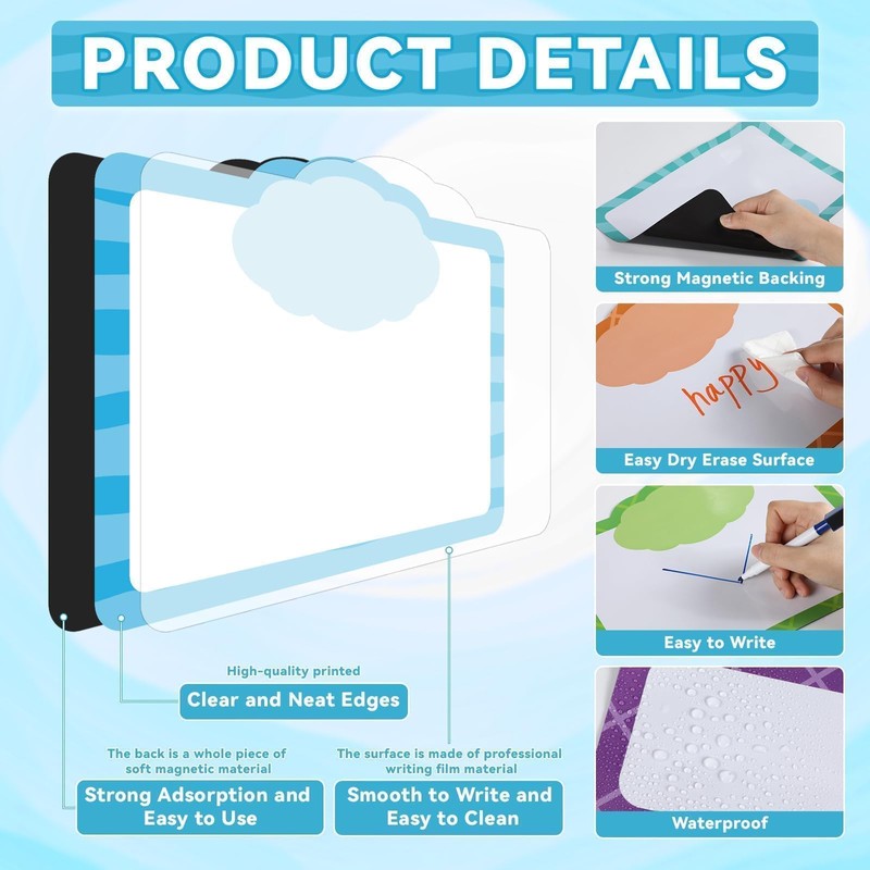 - Smooth writing and erasure: Our dry erase objectives learning magnets feature a special film that provides a smooth surface for writing with the included coloring pens. Easily erase your notes with a dry cloth or the brush tip of the pens, leaving behind a clean, no-smudge surface for repeated use.