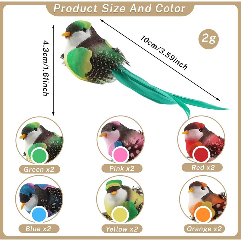 12 Pcs Multicolor Artificial Feather Garden Birds Clip Birds with Feathers Red Blue Yellow Pink Orange Turquoise
