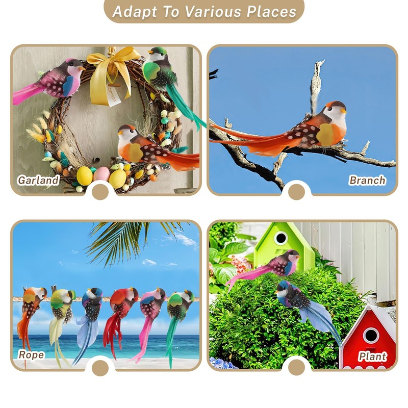 - DECORATIVE BIRDS:Set of 6 colorful artificial birds with detailed feather patterns and vibrant colors for garden and indoor use