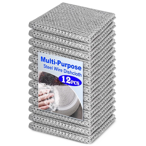12 Pcs Multipurpose Wire Dishwashing Rag, 7.87" x 7.87" Non Scratch Wire Dishcloth, Double-Layer Steel Wire Dishwashing Cloth Reusable Wire Cleaning Cloth for Cookware, Sinks, Dishes, Stove Tops