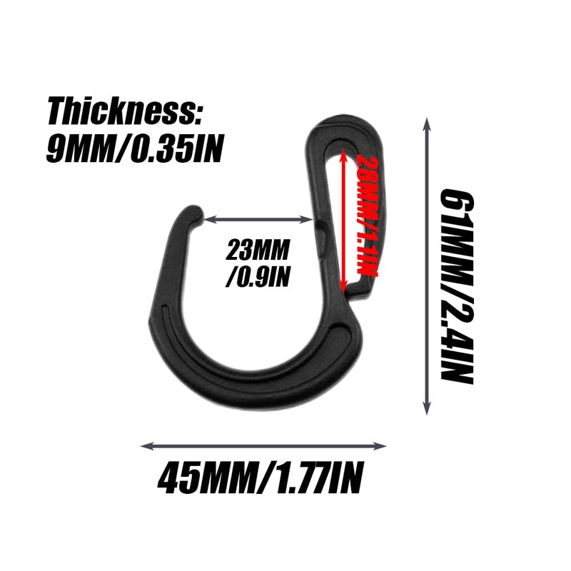 • Size: The size of the plastic hooks are approximately 61 x 45 x 9 mm 2.4 x 1.77 x 0.35 inch