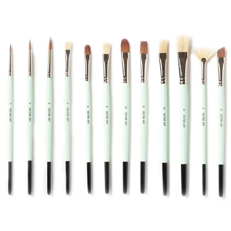 - SELECTED COLLECTION OF ARTIST BRUSHES: Vector Art has created this unique collection of artist brushes which we are very excited to share with you. This exclusive 12 piece collection contains 7 nylon and 5 hog hair brushes of various shapes and sizes. Please see our pictures which provide a handy diagram of what is included.